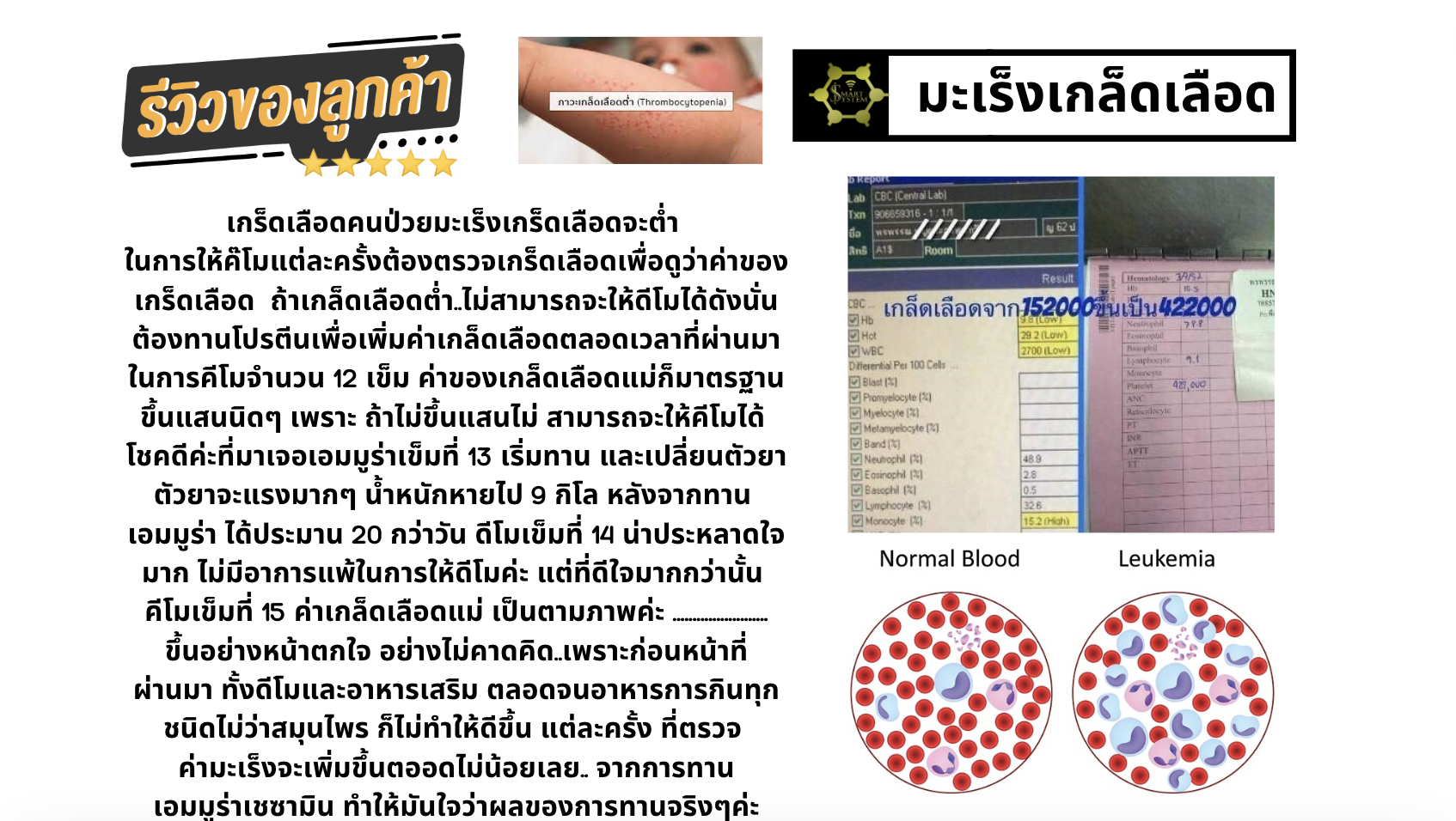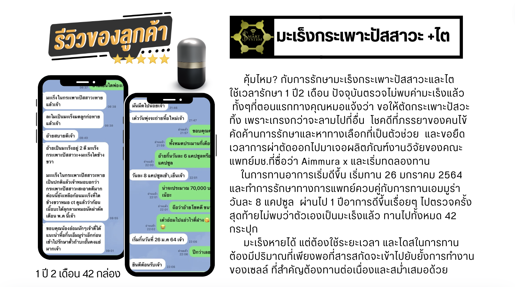 จึงเปิดใจสั่งมาทาน โดยเริ่มทาน จำนวน 2 เม็ด ก่อนอาหารเช้า-เย็น ประมาณ 7 วัน จึงเพิ่มปริมาณการทาน เช้า-กลางวัน-เย็น มื้อละ 2 เม็ด ทานได้ประมาณ 1 เดือน ถึงเวลาหมอนัด ทำการรักษาด้วยการคีโมเข็มแรก